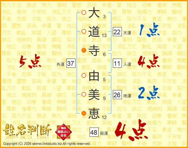 大(3画)道(13画)寺(6画) 由(5画)美(9画)恵(12画)