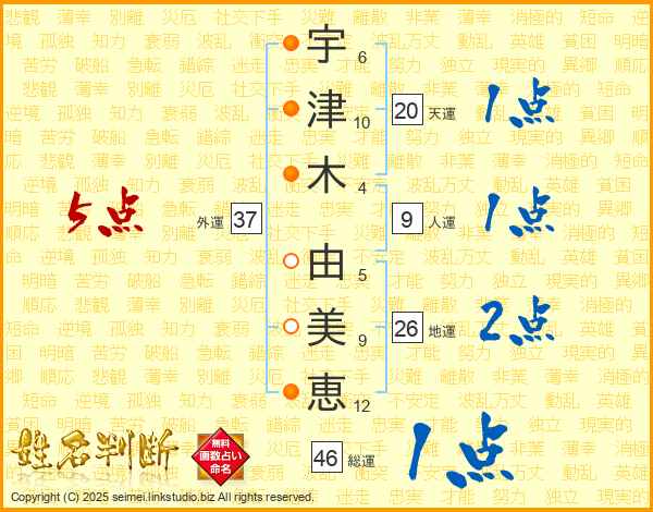 宇(6画)津(10画)木(4画) 由(5画)美(9画)恵(12画)