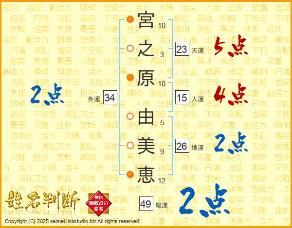 宮(10画)之(3画)原(10画) 由(5画)美(9画)恵(12画)