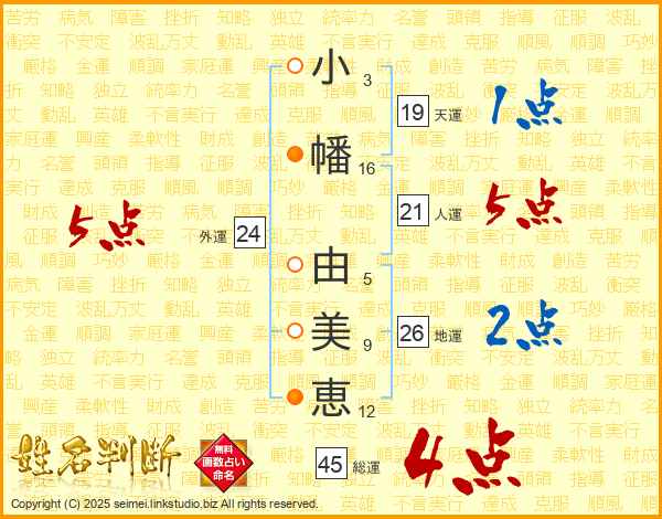 小(3画)幡(16画) 由(5画)美(9画)恵(12画)