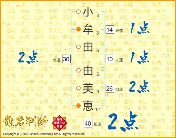小(3画)牟(6画)田(5画) 由(5画)美(9画)恵(12画)