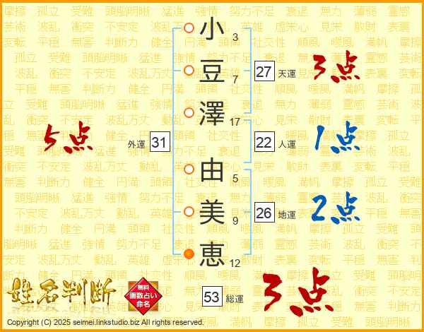 小(3画)豆(7画)澤(17画) 由(5画)美(9画)恵(12画)