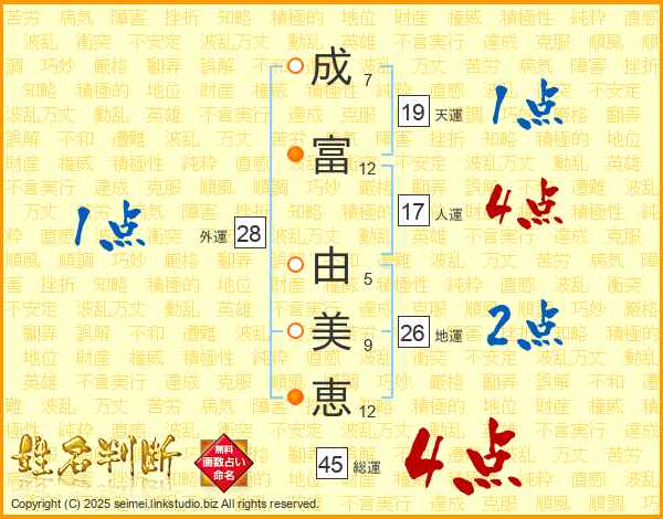 成(7画)富(12画) 由(5画)美(9画)恵(12画)