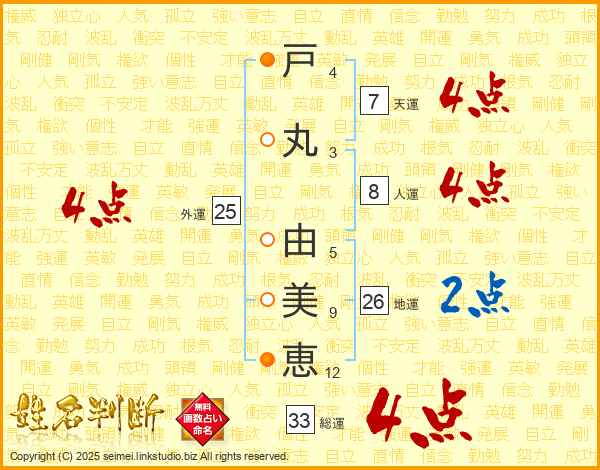 戸(4画)丸(3画) 由(5画)美(9画)恵(12画)