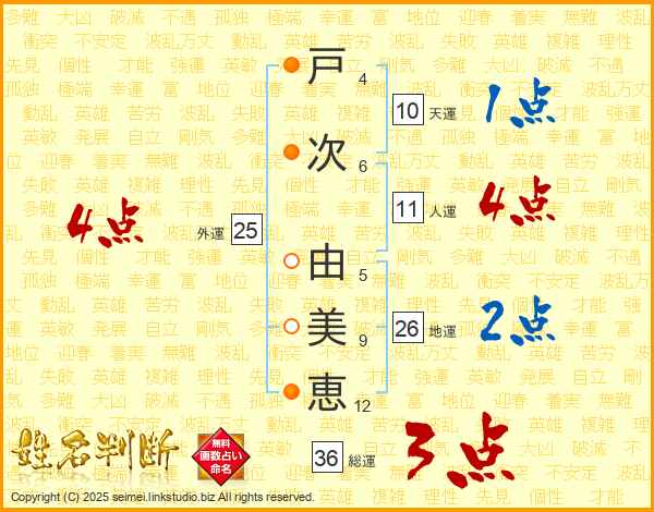 戸(4画)次(6画) 由(5画)美(9画)恵(12画)