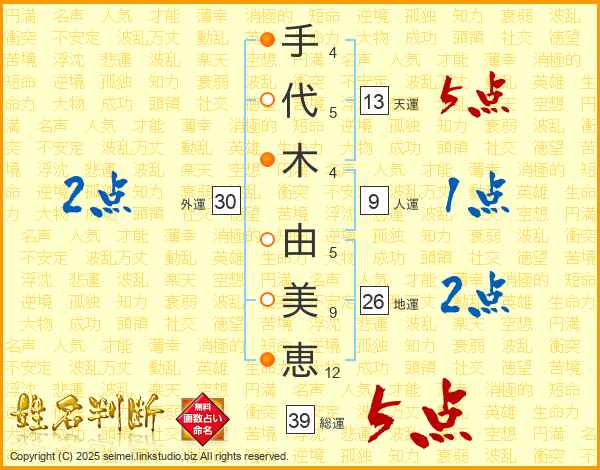 手(4画)代(5画)木(4画) 由(5画)美(9画)恵(12画)