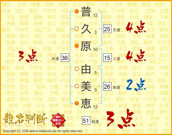 普(12画)久(3画)原(10画) 由(5画)美(9画)恵(12画)