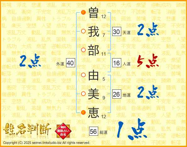 曽我部由美恵さんの天運は30画の2点!