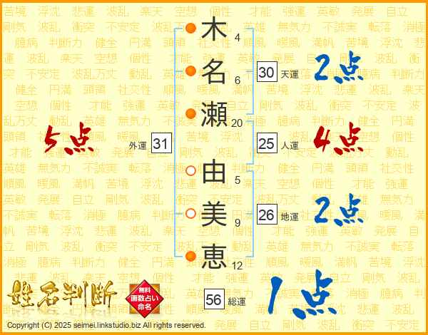 木(4画)名(6画)瀬(20画) 由(5画)美(9画)恵(12画)