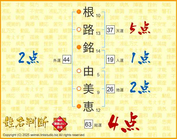 根(10画)路(13画)銘(14画) 由(5画)美(9画)恵(12画)