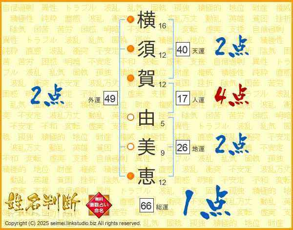 横(16画)須(12画)賀(12画) 由(5画)美(9画)恵(12画)