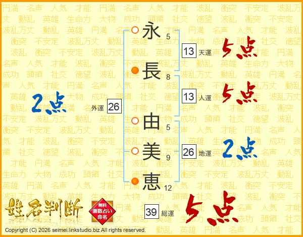 永(5画)長(8画) 由(5画)美(9画)恵(12画)