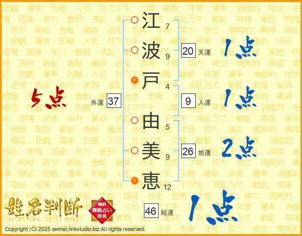 江(7画)波(9画)戸(4画) 由(5画)美(9画)恵(12画)