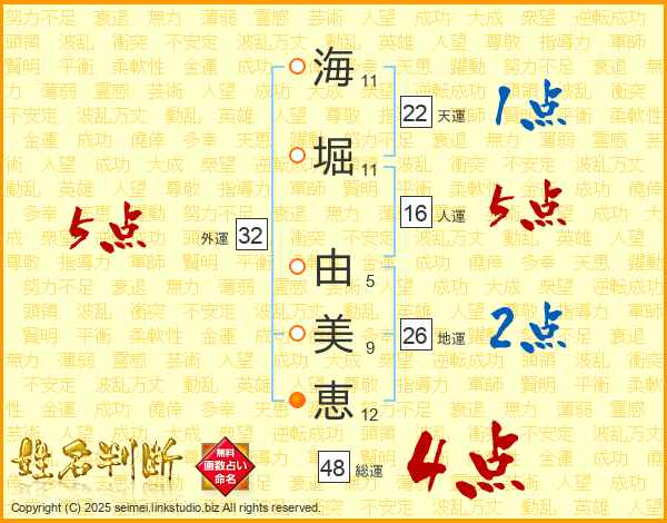 海(11画)堀(11画) 由(5画)美(9画)恵(12画)