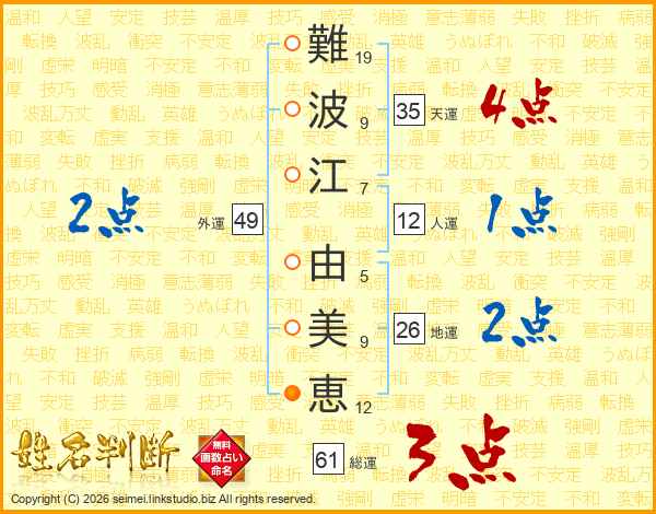 難(19画)波(9画)江(7画) 由(5画)美(9画)恵(12画)