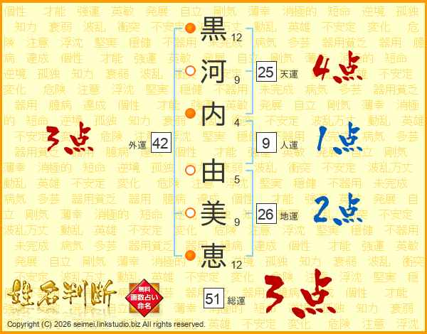 黒(12画)河(9画)内(4画) 由(5画)美(9画)恵(12画)