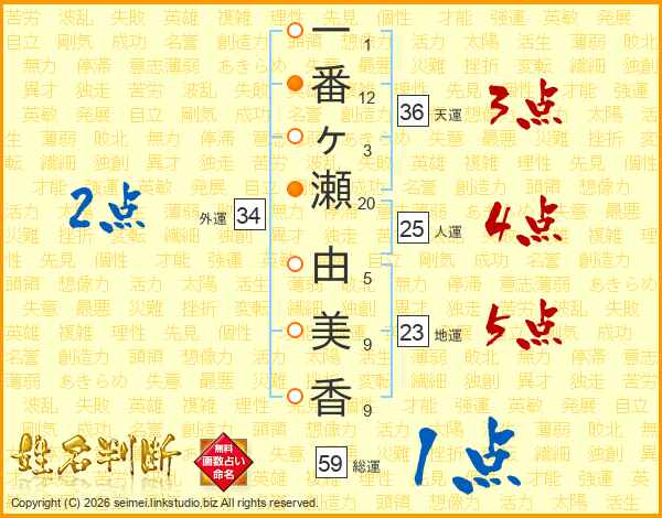 一(1画)番(12画)ヶ(3画)瀬(20画) 由(5画)美(9画)香(9画)