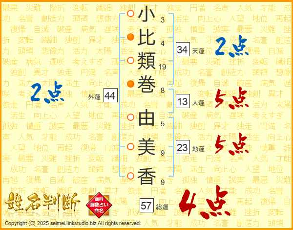 小(3画)比(4画)類(19画)巻(8画) 由(5画)美(9画)香(9画)