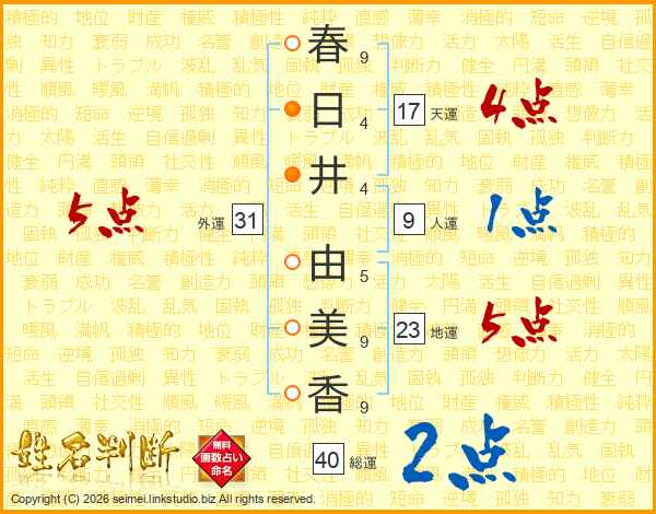 春(9画)日(4画)井(4画) 由(5画)美(9画)香(9画)