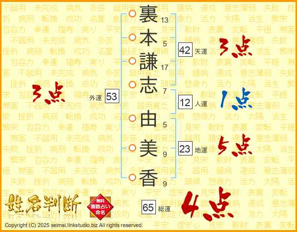 裏(13画)本(5画)謙(17画)志(7画) 由(5画)美(9画)香(9画)