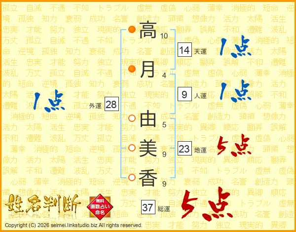 高(10画)月(4画) 由(5画)美(9画)香(9画)