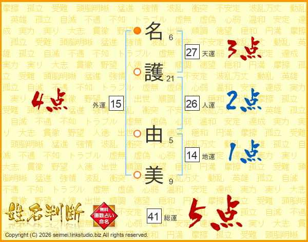 生活面を象徴する運勢です。外部から受ける影響力を表し、結婚運、家庭運や職場、環境への順応性を表します。総運から人運を引いた画数。姓や名が1文字の場合を除く。
