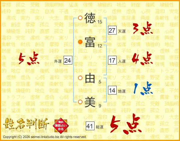 徳(15画)富(12画) 由(5画)美(9画)