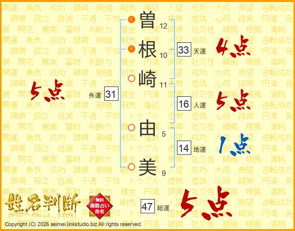 曽根崎由美さんの総運は47画の5点!