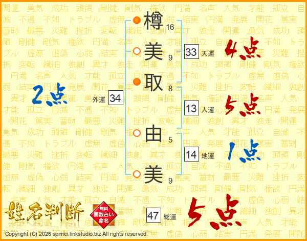 樽(16画)美(9画)取(8画) 由(5画)美(9画)