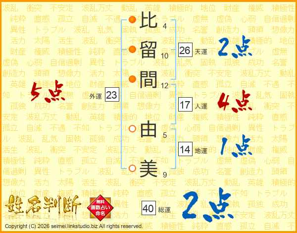 比(4画)留(10画)間(12画) 由(5画)美(9画)