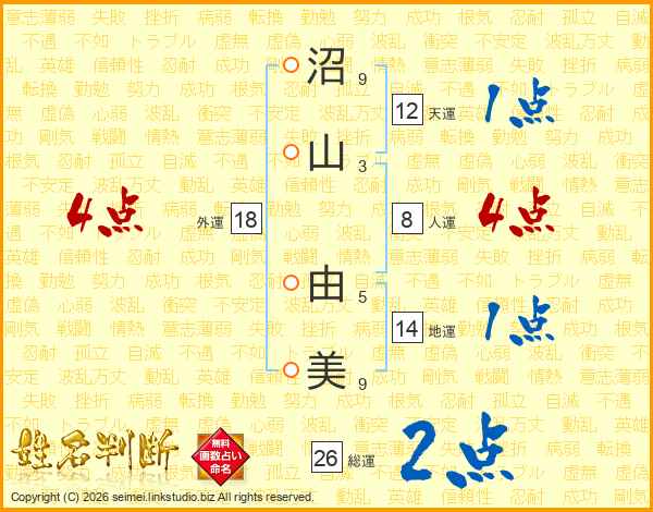 沼(9画)山(3画) 由(5画)美(9画)