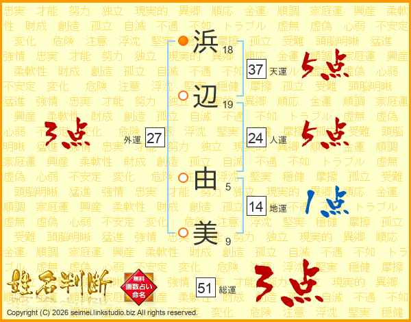 浜(18画)辺(19画) 由(5画)美(9画)