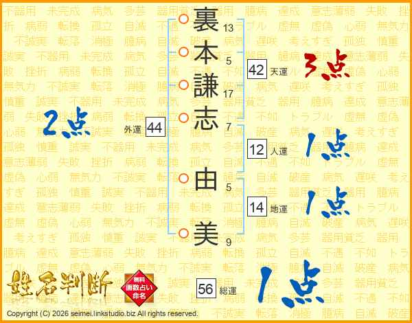 裏(13画)本(5画)謙(17画)志(7画) 由(5画)美(9画)