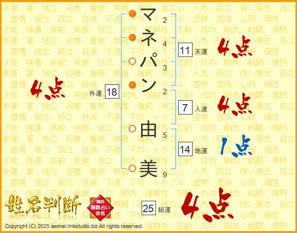 マ(2画)ネ(4画)パ(3画)ン(2画)  由(5画)美(9画)