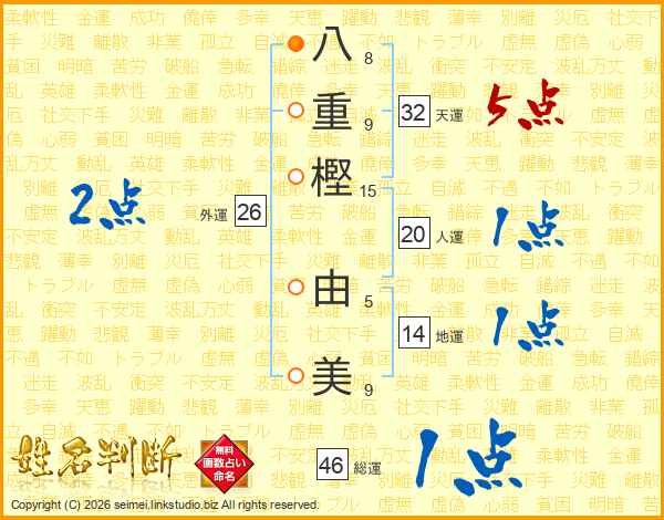 八(8画)重(9画)樫(15画) 由(5画)美(9画)