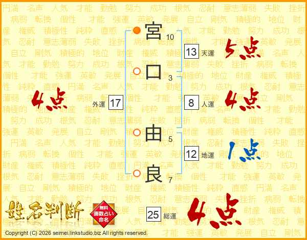 宮(10画)口(3画) 由(5画)良(7画)