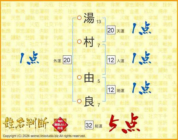 生活面を象徴する運勢です。外部から受ける影響力を表し、結婚運、家庭運や職場、環境への順応性を表します。総運から人運を引いた画数。姓や名が1文字の場合を除く。