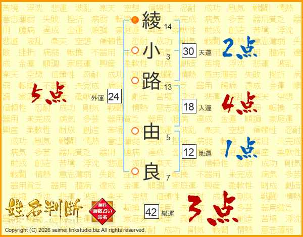 綾小路由良さんの総運は42画の3点!