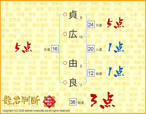 貞(9画)広(15画) 由(5画)良(7画)