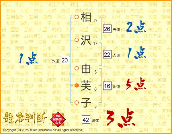 相(9画)沢(17画) 由(5画)芙(8画)子(3画)