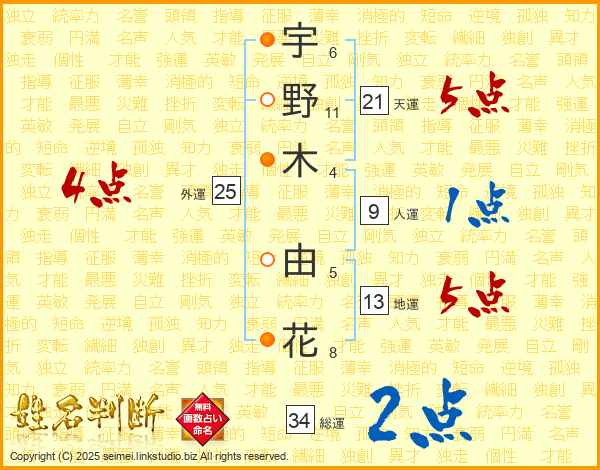 宇野木由花さんの天運は21画の5点!