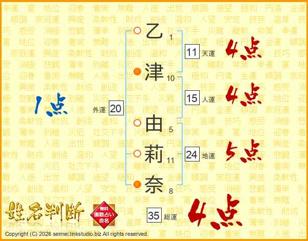 乙(1画)津(10画) 由(5画)莉(11画)奈(8画)