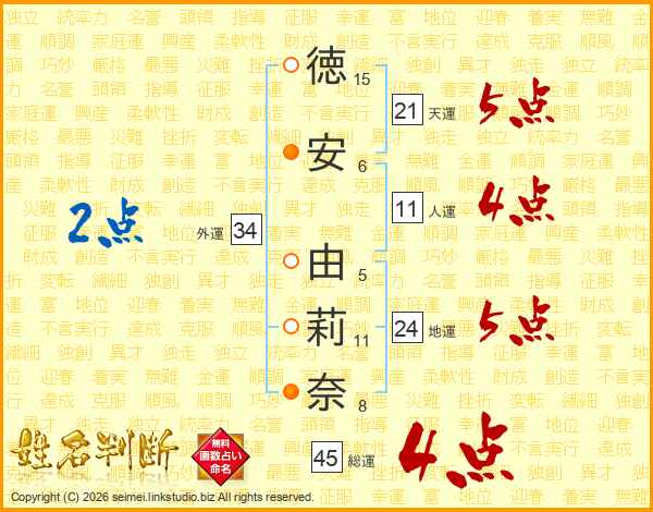 徳安由莉奈さんの総運は45画の4点!