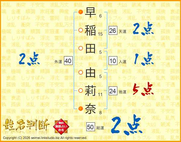 早(6画)稲(15画)田(5画) 由(5画)莉(11画)奈(8画)