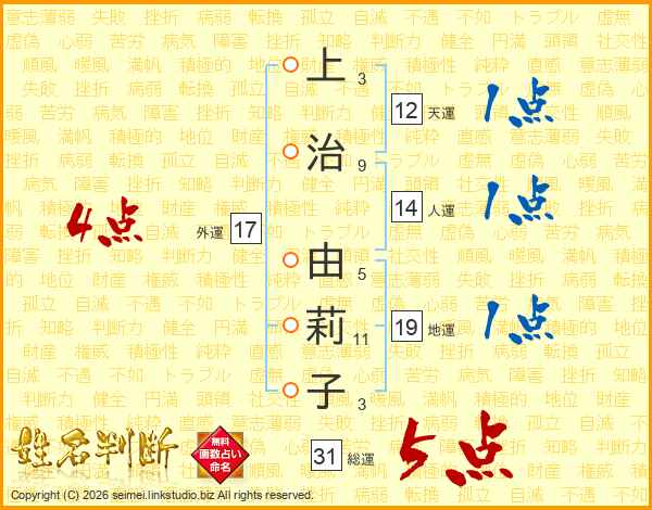 上(3画)治(9画) 由(5画)莉(11画)子(3画)