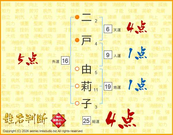 二戸由莉子さんの総運は25画の4点!