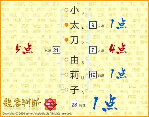 小(3画)太(4画)刀(2画) 由(5画)莉(11画)子(3画)