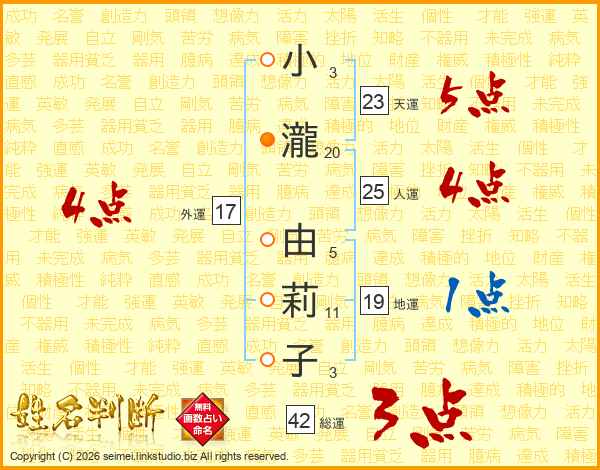 小瀧由莉子さんの天運は23画の5点!