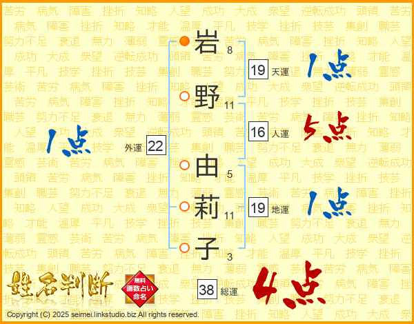 岩(8画)野(11画) 由(5画)莉(11画)子(3画)