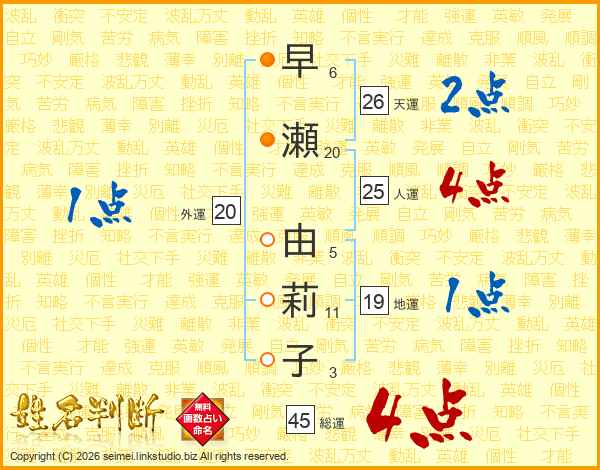 早(6画)瀬(20画) 由(5画)莉(11画)子(3画)